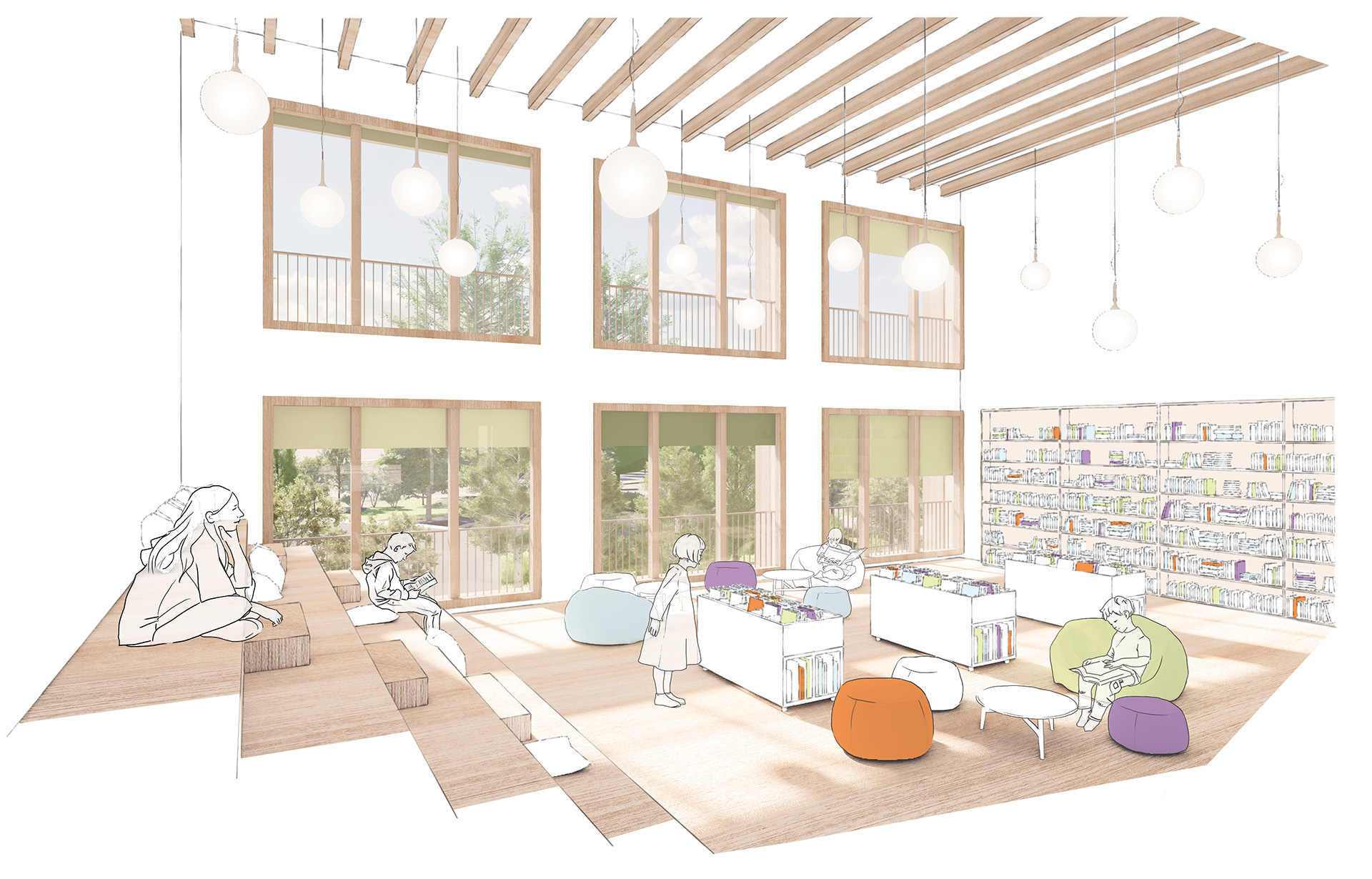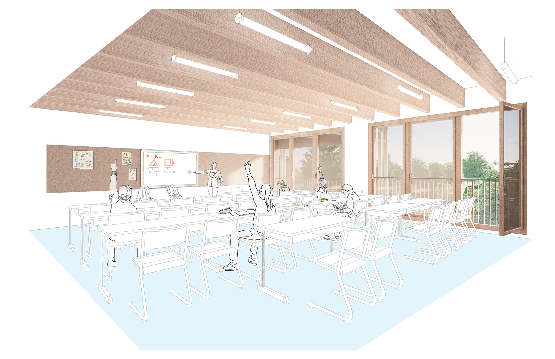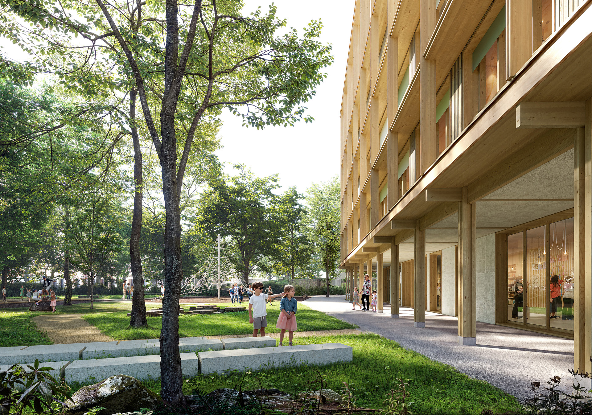 L’école offre un cadre d’apprentissage privilégié qui s’inscrit dans une pédagogie du vivant : les circulations, les ouvertures, la lumière naturelle et les dispositifs extérieurs – jardin pédagogique, cours inclusives, forum végétal – favorisent une relation permanente des enfants avec leur environnement, tout en renforçant le sentiment d’appartenance à une école ouverte et vivante.