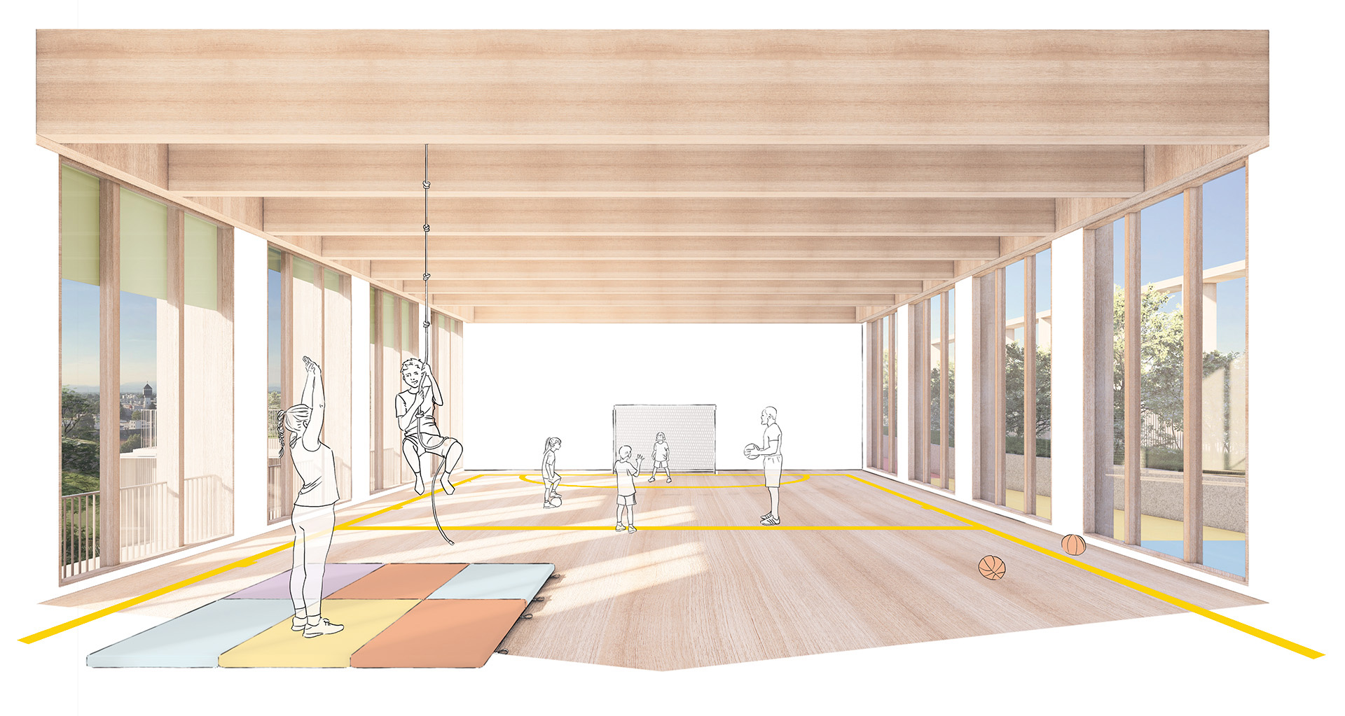 Au sommet, la salle d’évolution se place au-dessus des cimes : belvédère dans la canopée, traversante et naturellement ventilée, elle devient un nouveau repère dans le paysage urbain.