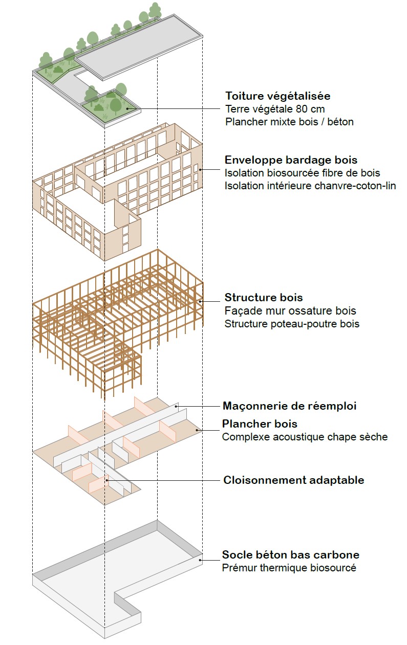 Le projet vise une labellisation bâtiment passif. Structure bois porteuse, maçonnerie de réemploi, isolants biosourcés, matériaux durables et bas carbone signent une ambition environnementale forte.