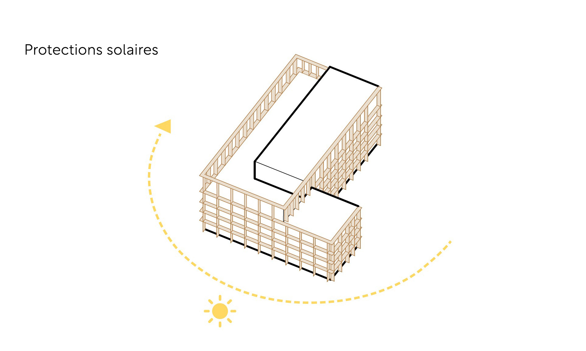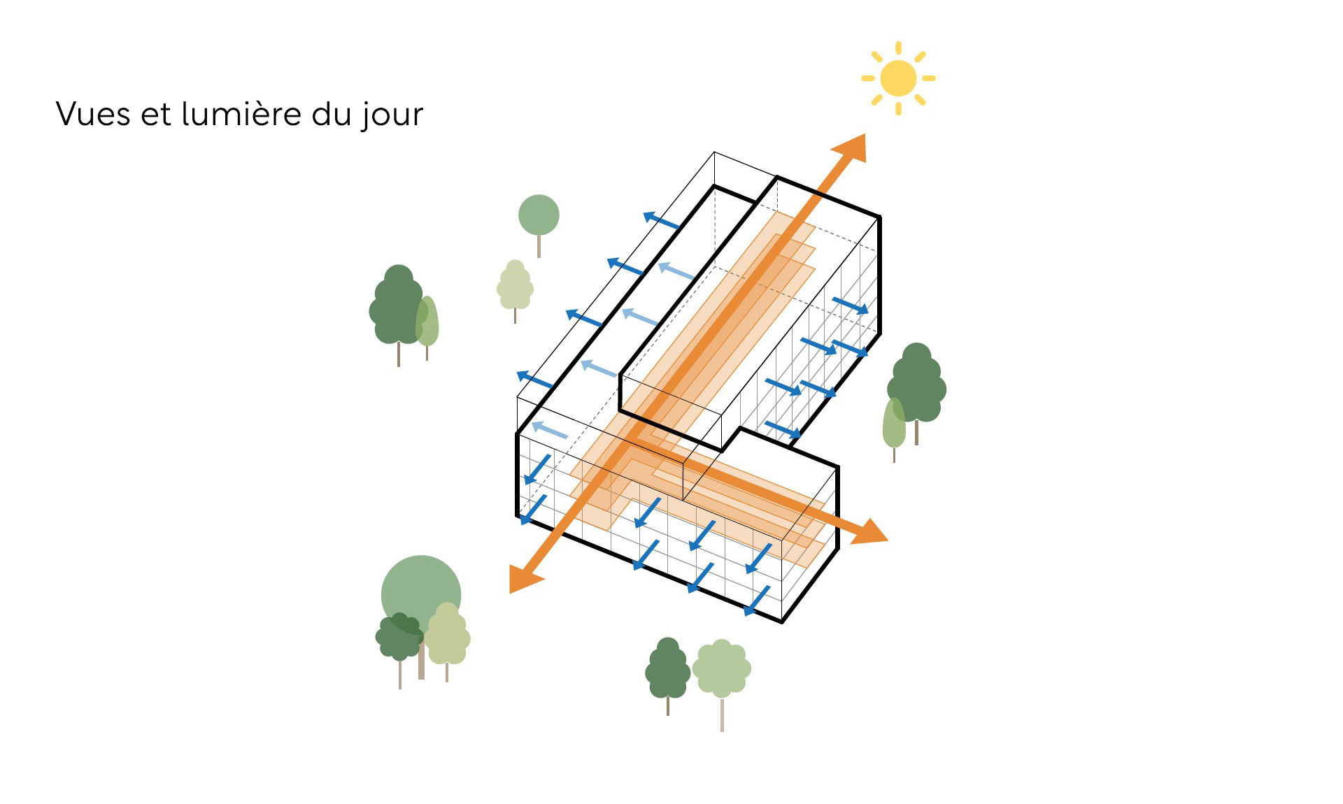 La volumétrie compacte -R+3 surmonté d’une salle d’évolution en R+4 – limite l’emprise au sol et libère un maximum de pleine terre. Dans une logique bioclimatique, l’orientation des classes optimise les apports solaires hivernaux tout en maîtrisant les surchauffes estivales grâce à des dispositifs passifs simples et efficaces.