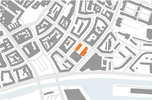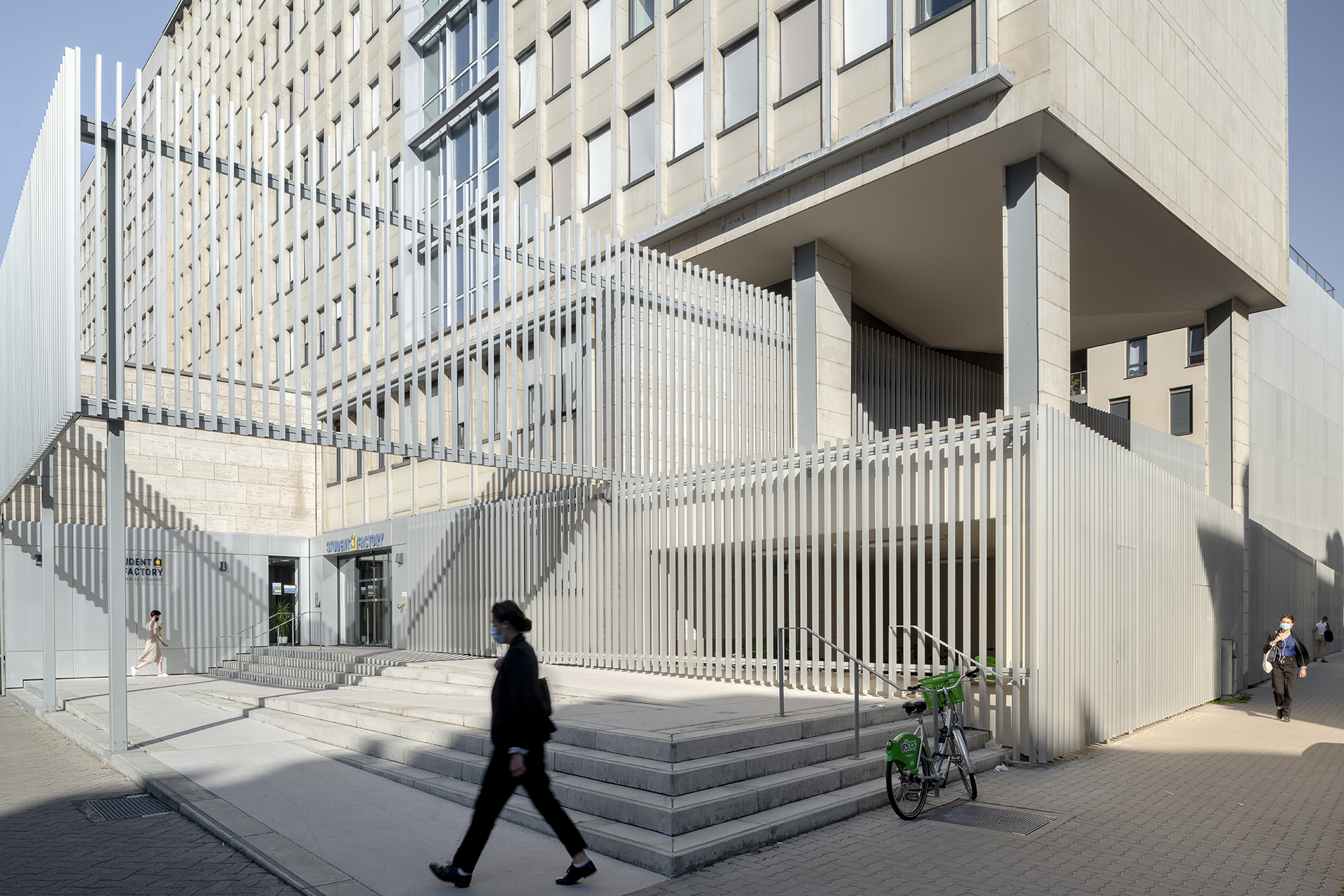 Des volumes en porte-à-faux signalent l’entrée. Habillés de lames métalliques qui s’étirent le long de la rue, ils enjambent 50 ans d’histoire de l’architecture pour faire le lien avec un immeuble neuf. La différentiation du socle valorise l’existant et unifie l’ensemble.