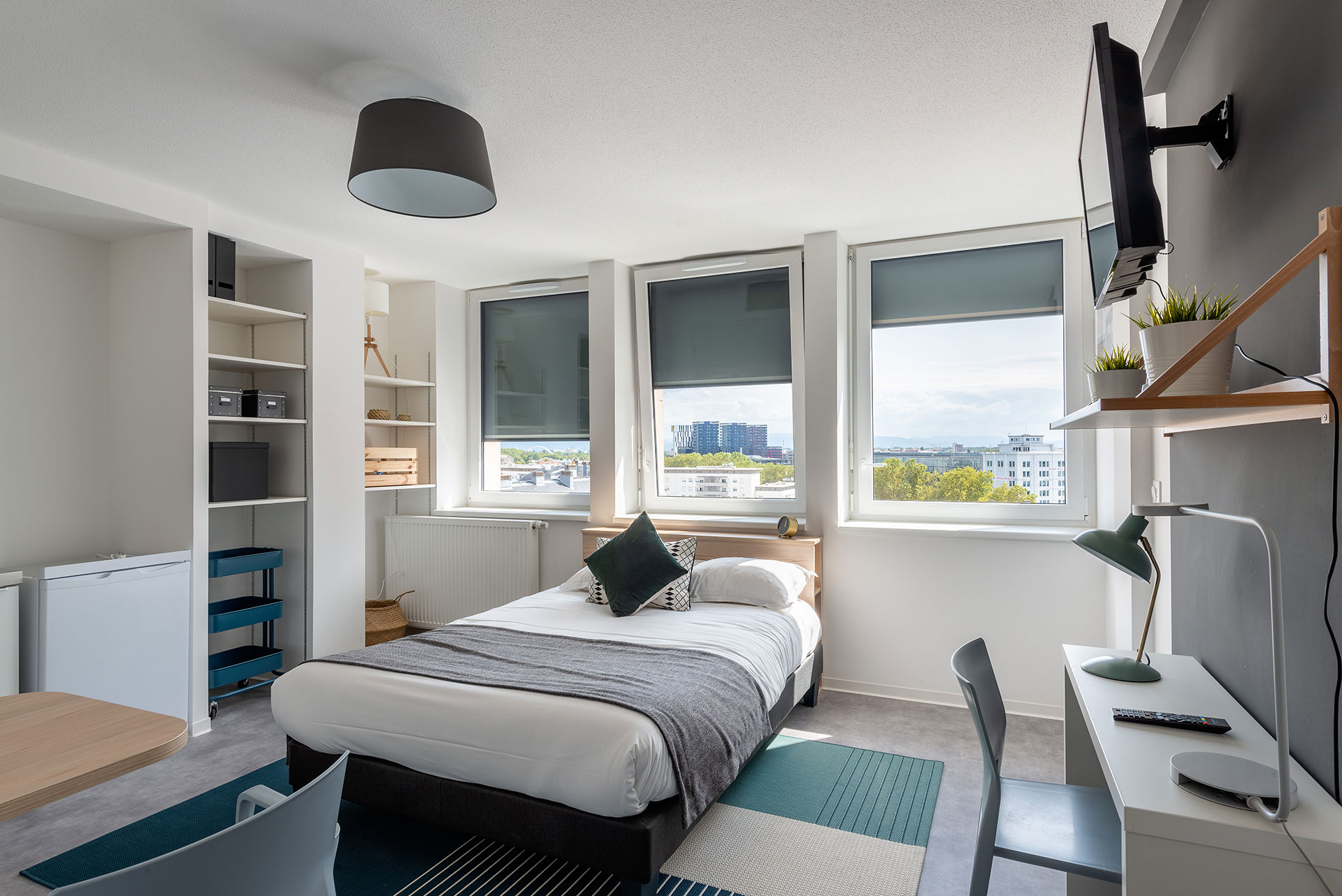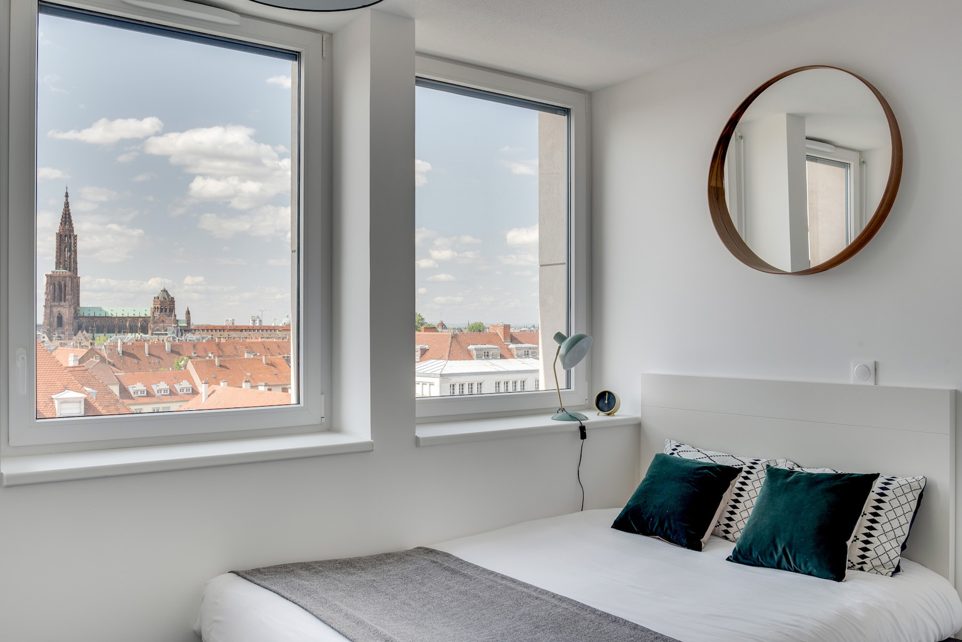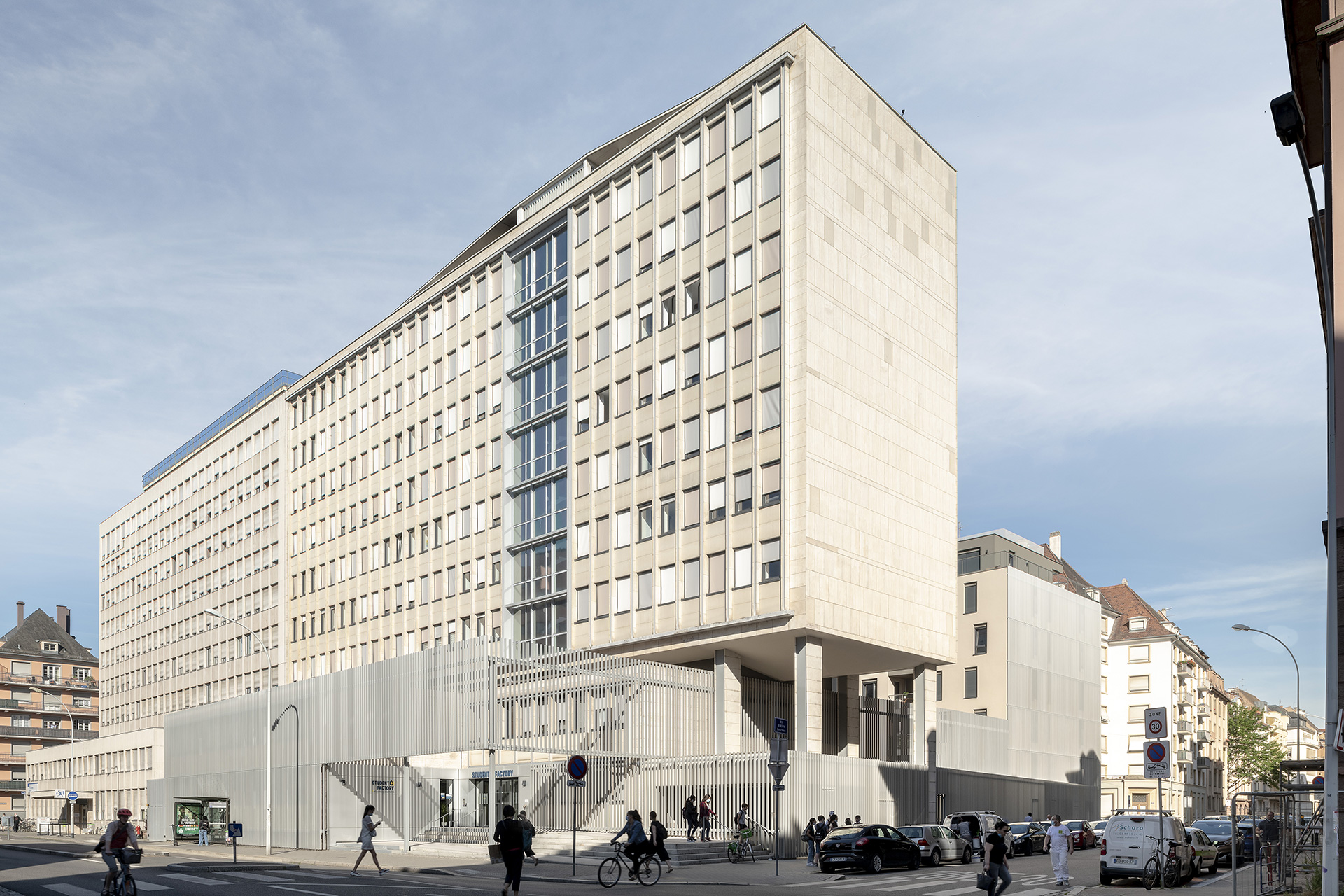 La reconversion de l’ancien siège de la CAF du Bas-Rhin met à profit la trame simple et rythmée des anciens bureaux, typique des années 60, pour en faire des logements étudiants.