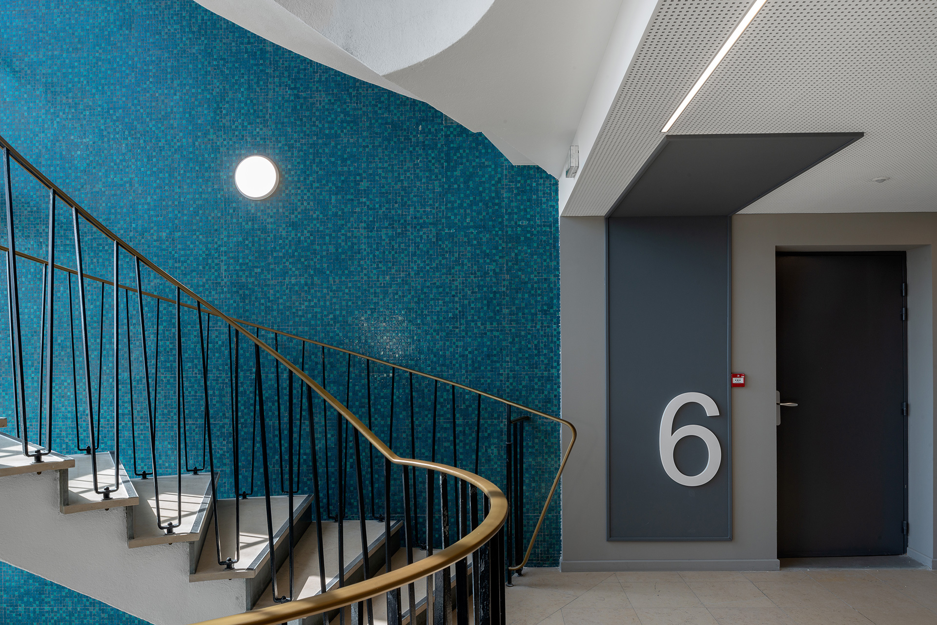La structure existante est intégralement conservée, tout comme l’escalier monumental et sa mosaïque en faïence bleue, ainsi que les ascenseurs, véritables éléments fondateurs du bâtiment. Le projet révèle ces qualités patrimoniales, témoins du soin apporté aux détails de l’architecture de cette époque.